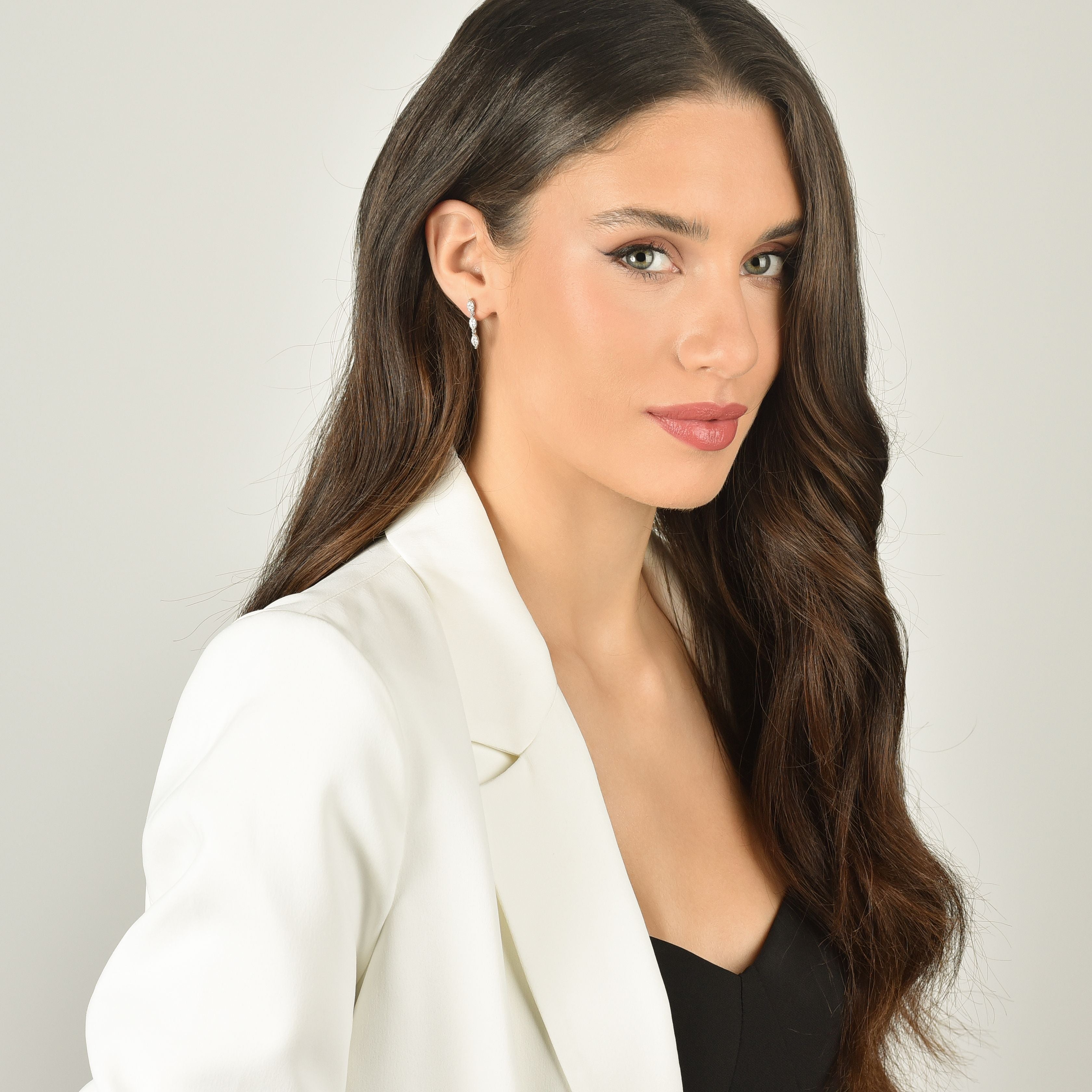 Orecchini in argento con zirconi bianchi. Questi orecchini pendenti in argento con zirconi bianchi sono una scelta di gioielli che incarna brillantezza e raffinatezza, grazie ai loro zirconi che catturano la luce in maniera stupefacente.