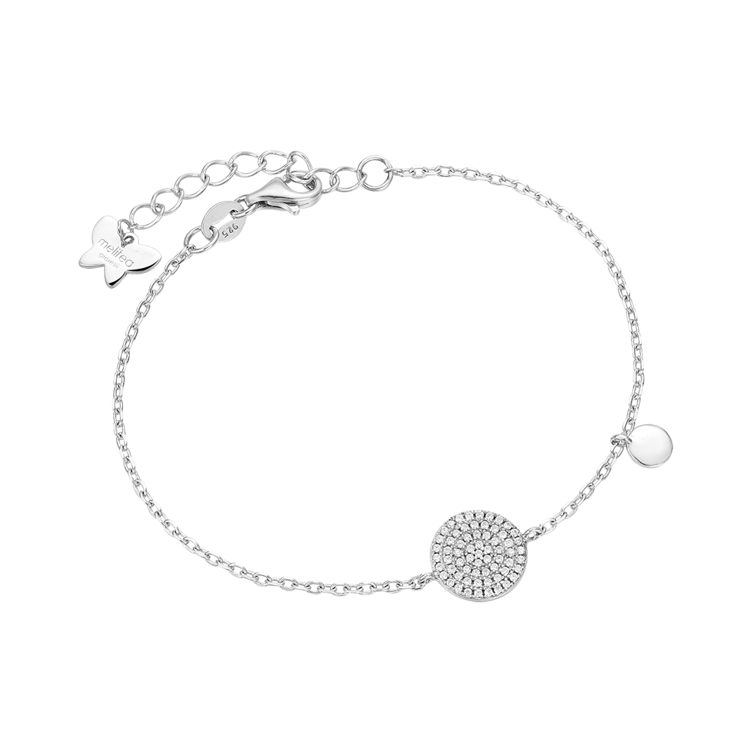 Bracciale in argento con elemento torno con zirconi bianchi. Lunghezza: 16 + 3 cm. Dimensione elemento: 11 x 11 mm. L'argento lucente completa il design con eleganza e semplicità, mettendo in risalto la bellezza intrinseca dell'elemento tondo e la scintillante luminosità degli zirconi. Questo bracciale è una dichiarazione di stile sofisticato e di classe, perfetto per arricchire il tuo look quotidiano o per aggiungere un tocco di eleganza alle tue occasioni speciali.