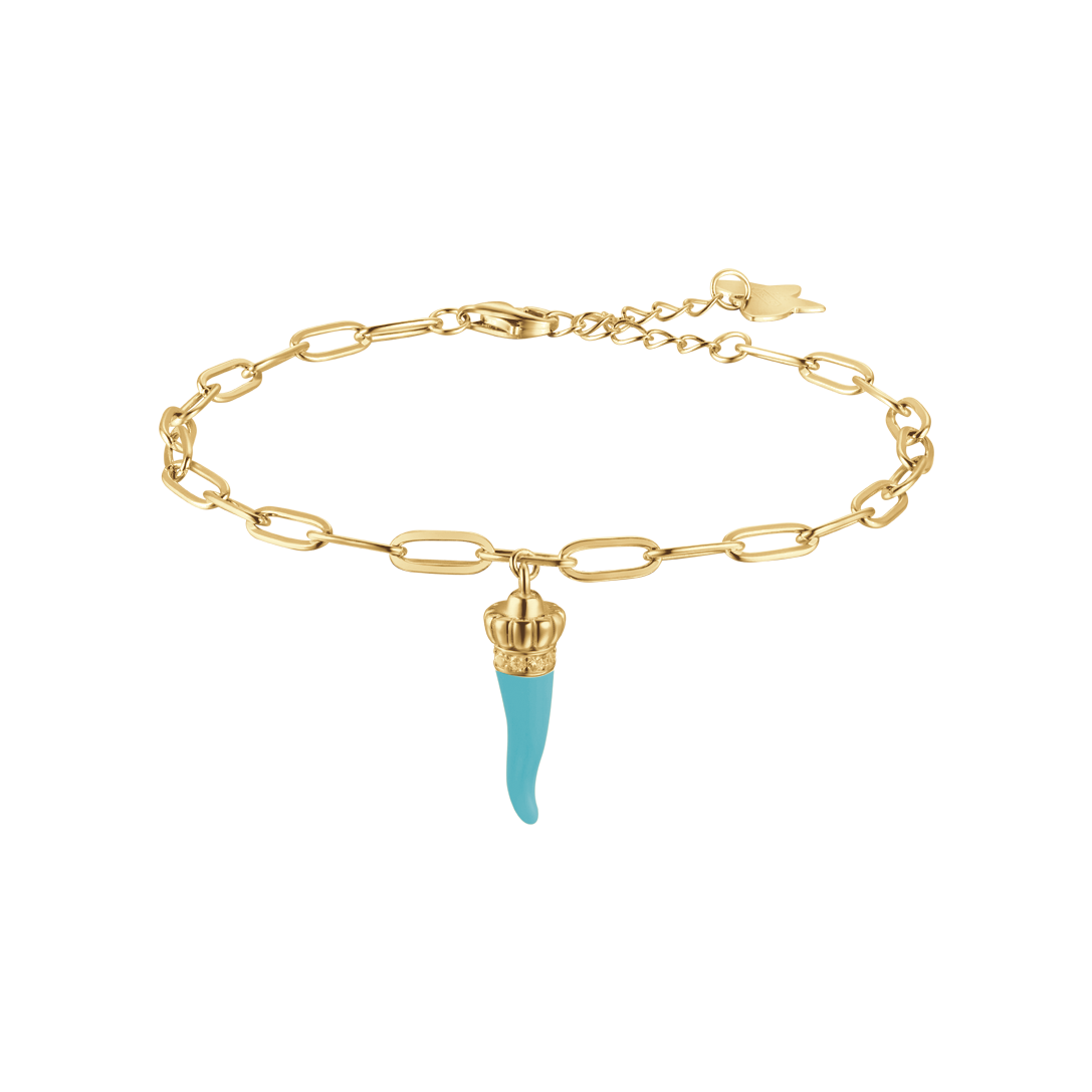 BRACCIALE IN ARGENTO IP GOLD CON CORNO TURCHESE E QUADRIFOGLIO